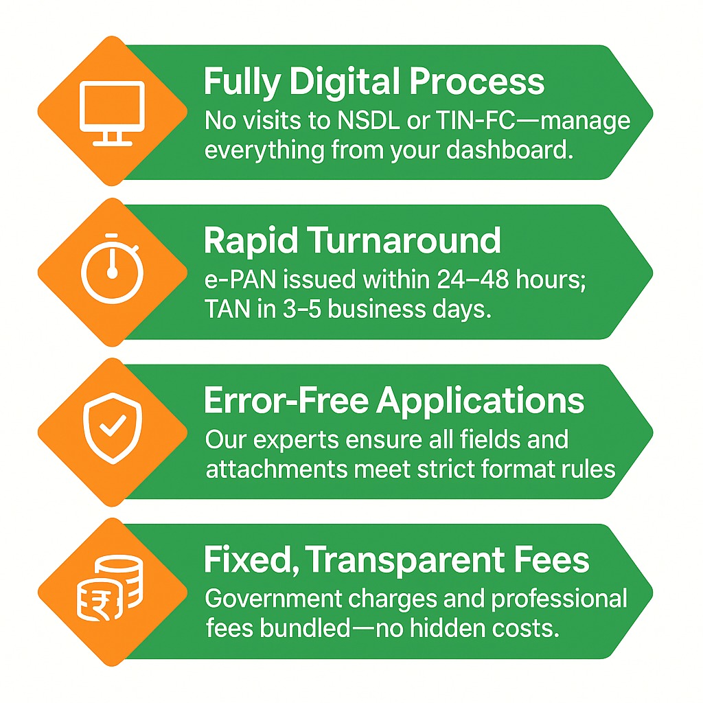Rapid Turnaround: e‑PAN issued within 24–48 hours of approval; TAN in 3–5 business days.